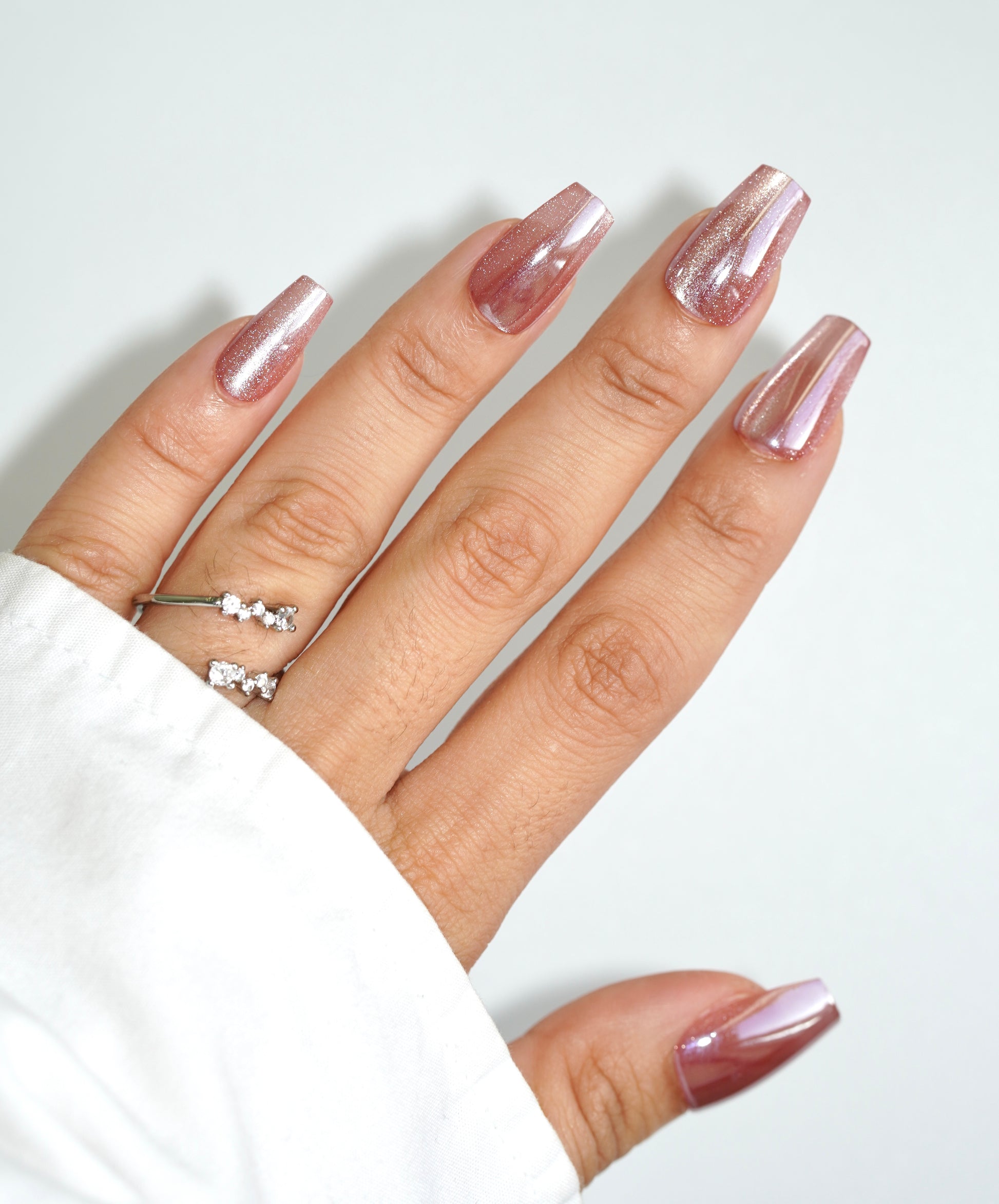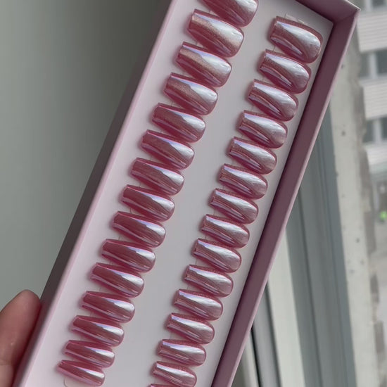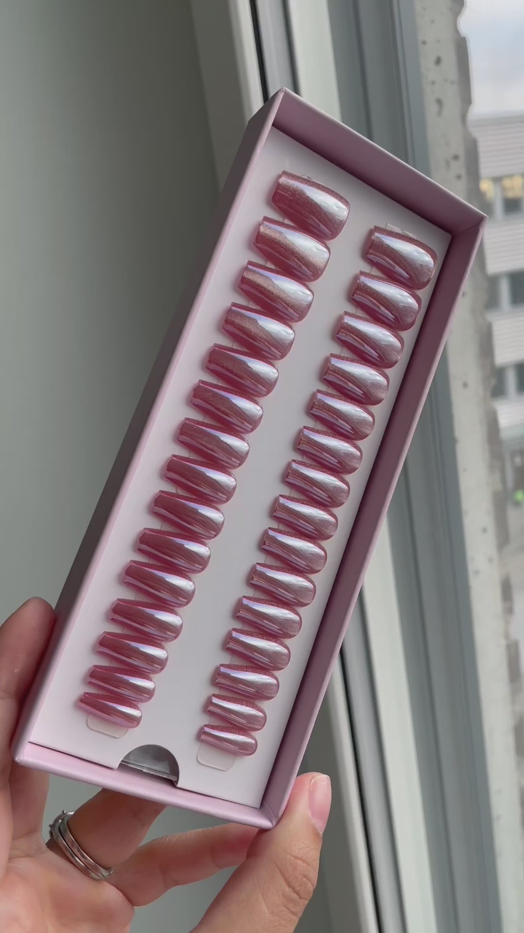 För en look som kombinerar romantik och glamour, välj våra Crystal Rose press-on naglar i coffin form. Den skimrande rosérosa nyansen fångar ljuset vackert, medan den trendiga coffin formen ger en elegant och modern silhuett. Perfekta för både vardag, fest och speciella tillfällen när du vill sticka ut med en sofistikerad nageldesign.